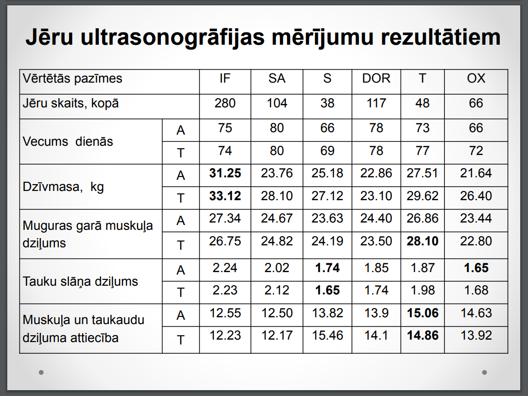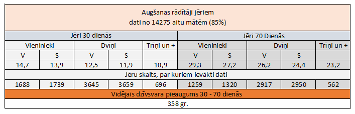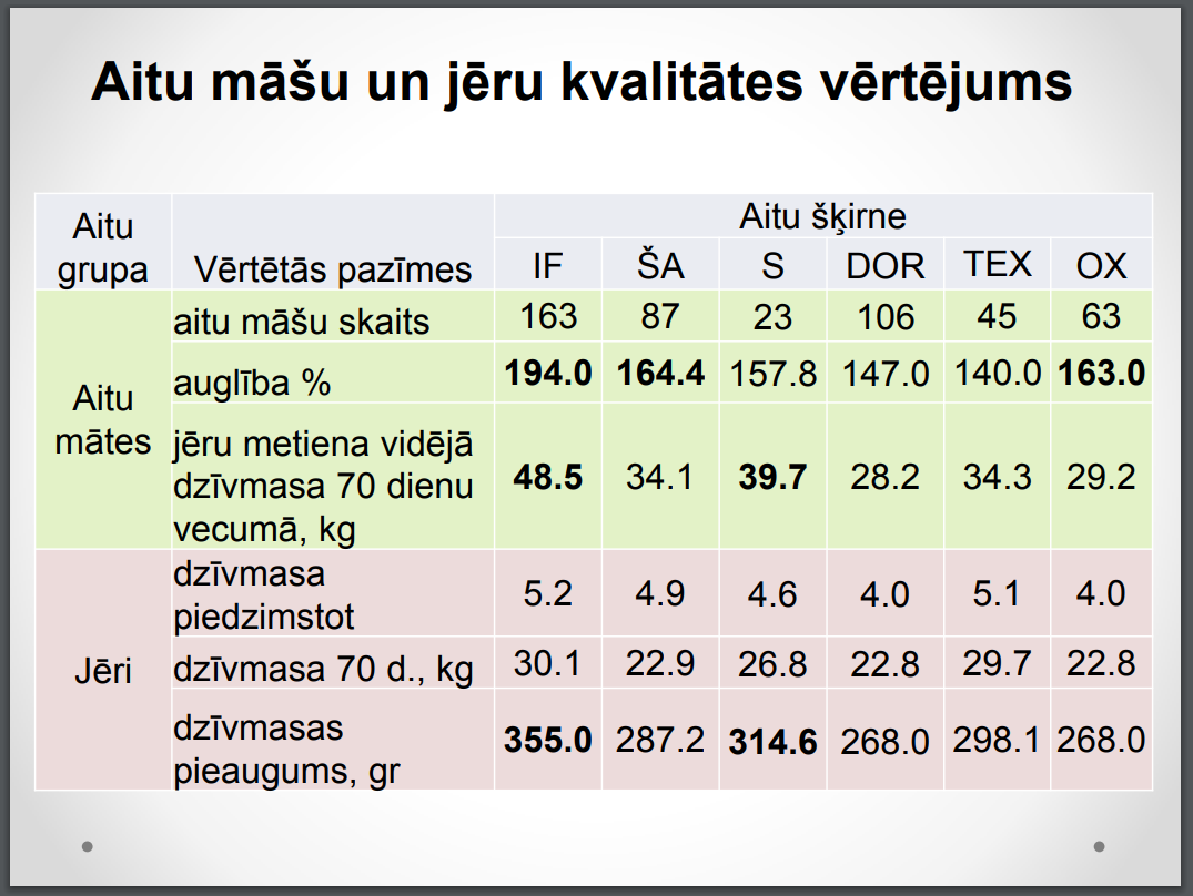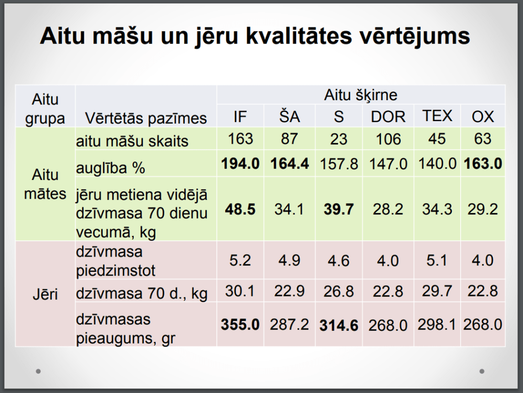 Lai gan rezultāti tika ievākti pirms trīs gadiem, domājams, ka tie joprojām ir aktuāli un parāda tendences. Tā kā audzējam tikai Ile de France šķirnes dzīvniekus diemžēl nav salīdzinājums ar tīršķirnes LT jēru pieaugumu, bet to iespējams atrast dažādos LAAA projektos un noteikti arī savas saimniecības pieredzē.