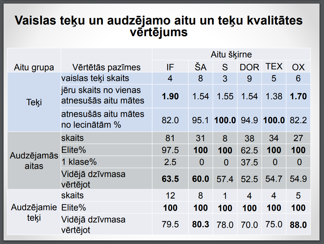 Šādu ātrāku jaunaitu kvalitātes novērtējumu un metodiku aizguvām no Francijas, kur to lieto ļoti daudz. Jāpiebilst, ka to ir iespējams veikt, ja ir sagatavota laba barības bāze un ir iespējams nodrošināt kontrolētu barošanu teju visā periodā. Mēs gan jaunaitas vasaras periodā laidām ganībās, bet nodrošinājām ļoti biežu to mainību un kvalitāti.