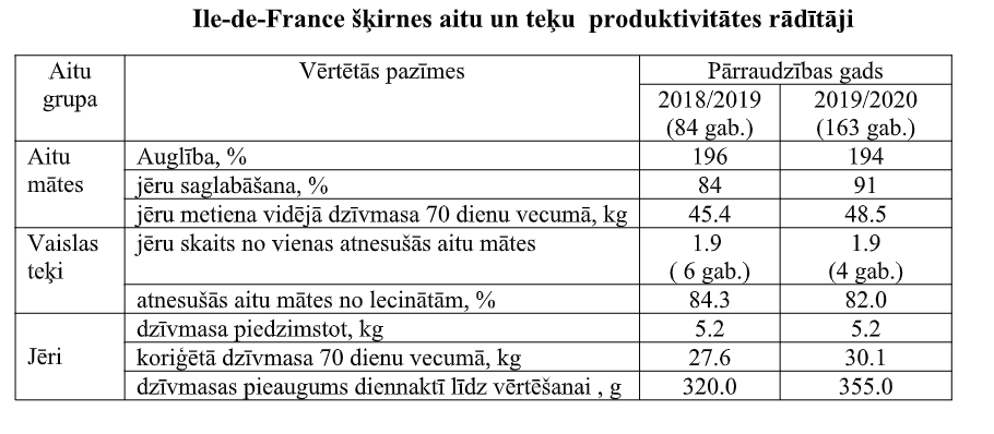 Ile de France ir šķirne ar milzīgu potenciālu un iespējām, ko noteikti vēl neesam pilnībā izmantojuši arī savā saimniecībā. Bet, analizējot rezultātus un salīdzinot visas Latvijā audzētās gaļas šķirnes, redzam Ile de France šķirnes lielo potenciālu un labus ekonomiskos rādītājus – iegūtais un saglabātais jēru skaits no vienas aitu mātes un to iespējami ātrāka realizācija, ir saimniekošanas ekonomiskais pamats, realizējot jērus gaļas tirgū.