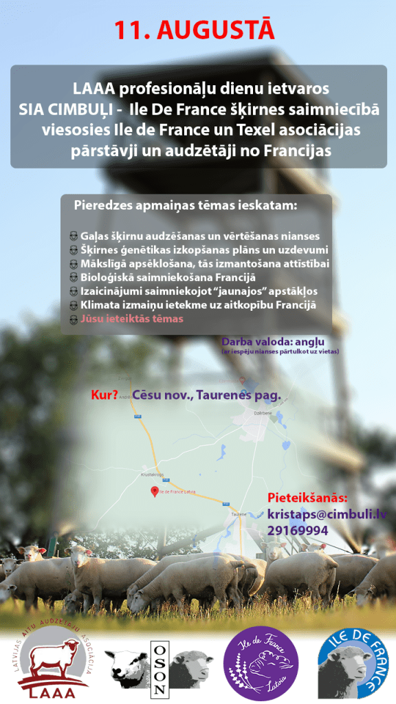 11. un 12. augustā Latvijā viesosies Ile de France un Texel šķirnu asociācijas OSON pārstāvji un šķirnes saimniecību saimnieki no Francijas.